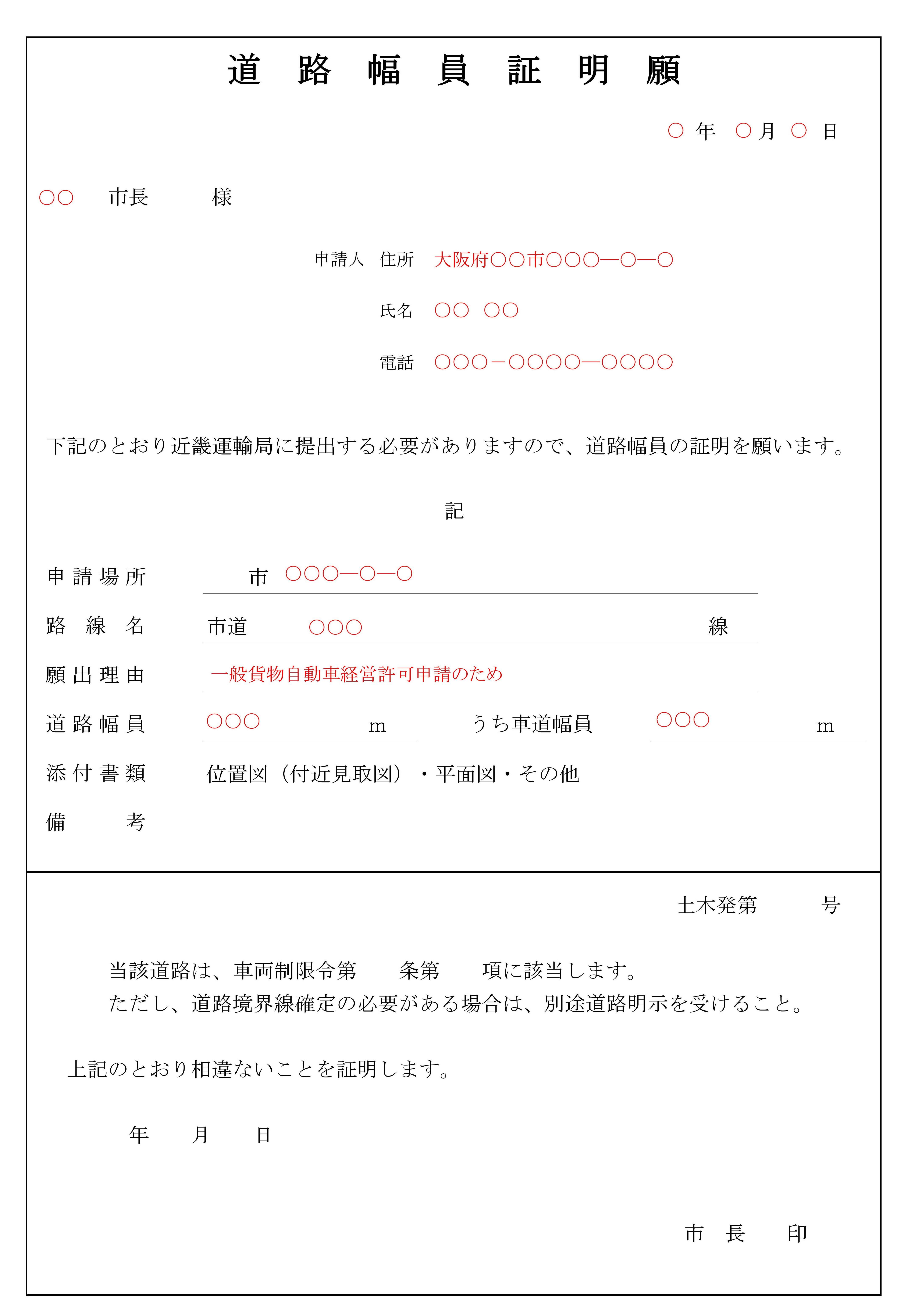 幅員証明を取得する必要のある道路から様式を入手します。道路管理者は「市道」であれば市役所の道路管理課等、「県道」であれば県の道路管理課等です。国道の場合は不要な場合が多いです。
