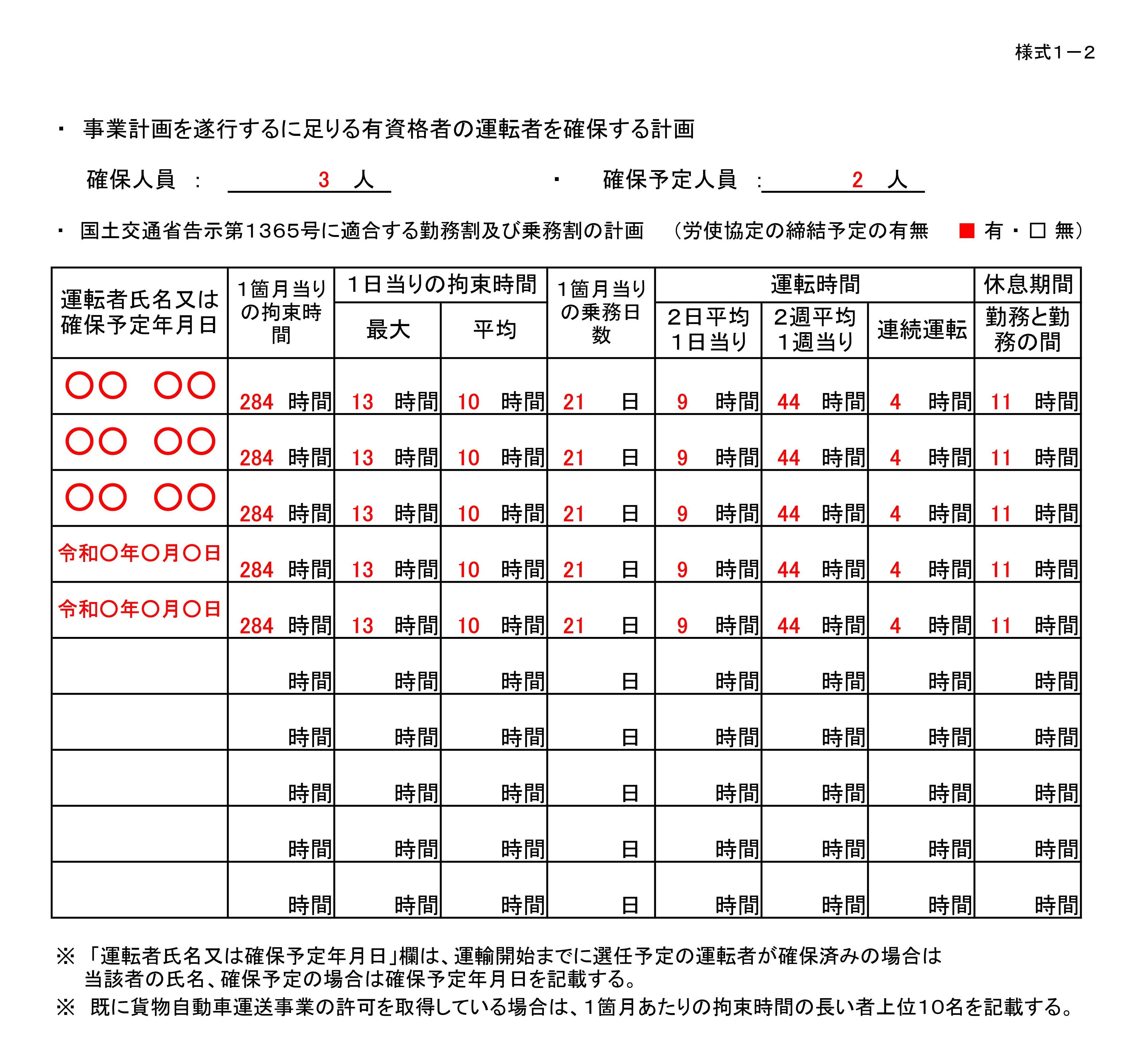 ●有資格者の運転者を確保する計画(様式1−2)